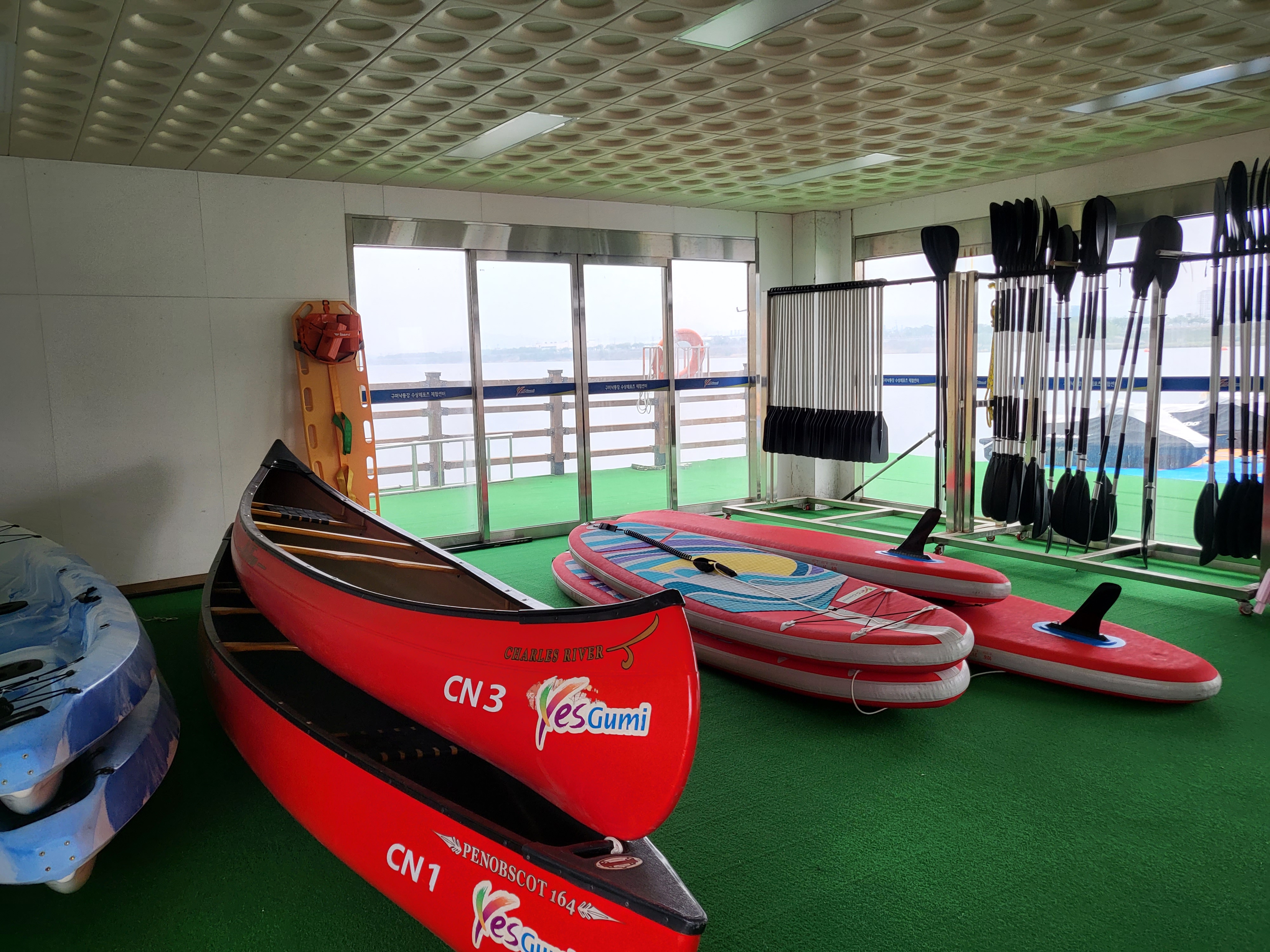 저희가 이용할 카약, 카누, 패들보트 등이랑 노가 있어요
