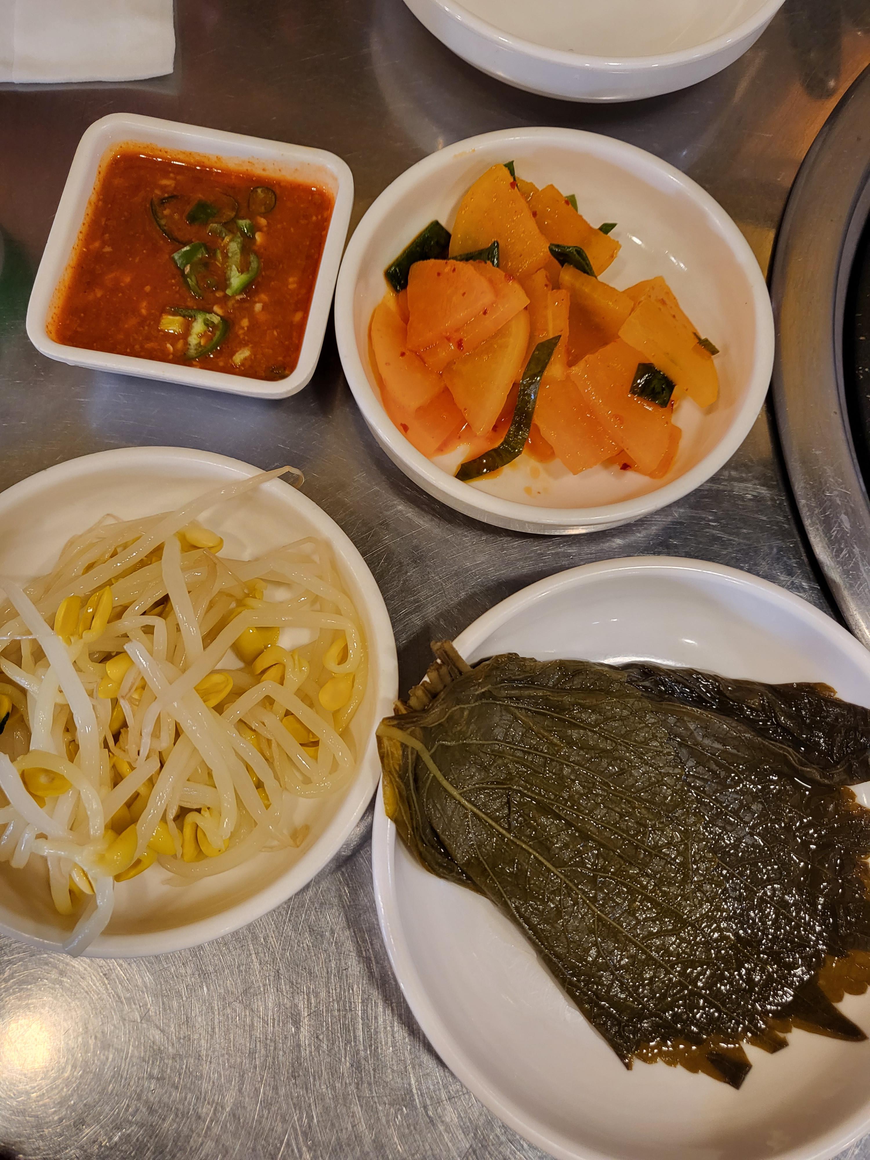 막창 소스, 단무지무침, 콩나물, 깻잎절임