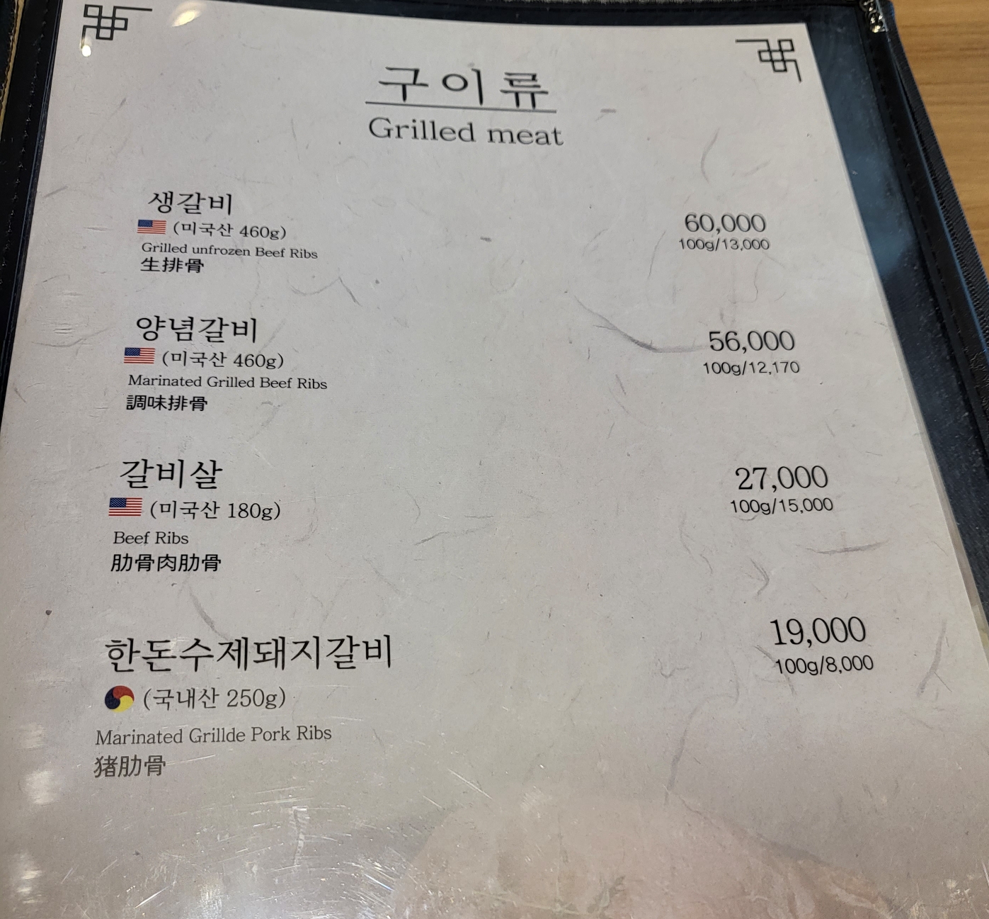 구이류는 생갈비, 양념갈비, 갈비살