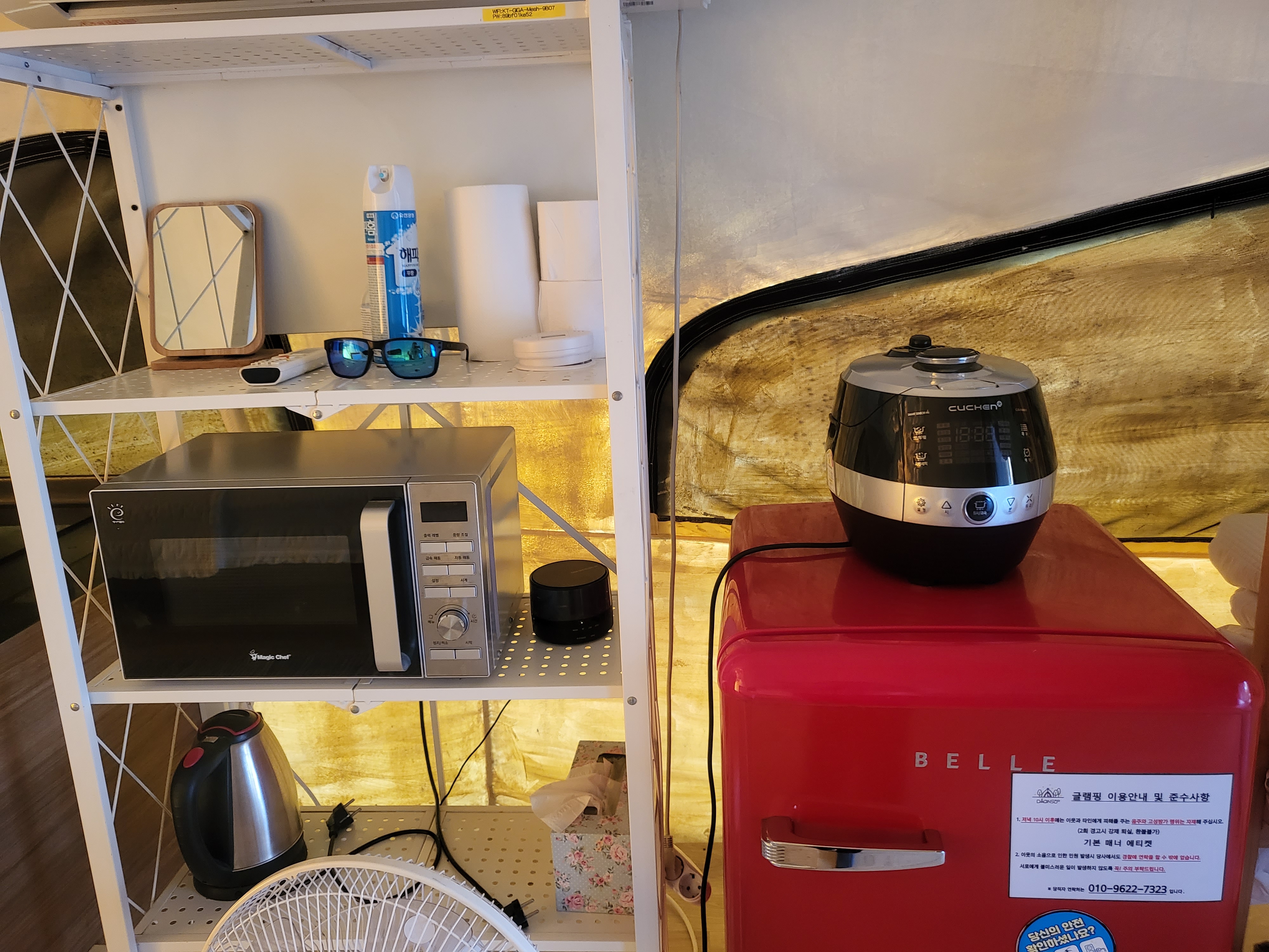 밥솥, 선풍기, 전기포트, 전자레인지 등 있고요